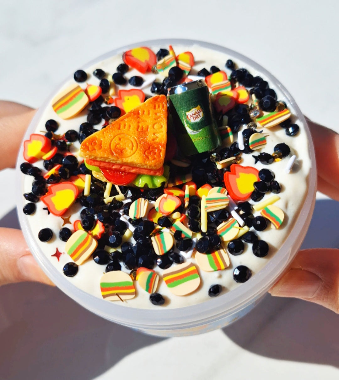 Add-ins: 8-burger special fimo and bead mix, one ginger ale can charm, one definitely a tuna melt and not a non-descript meat sandwich charm